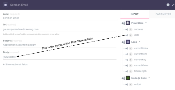 where ‘a2’ is the ID for the last Flow Store. This variable will have a set of key-value pairs retrieved from the Flow Store action. You can customize the email body format at any time.