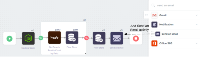 Step 10: Add Send an Email action from the Notification section, and connect it to the Flow Store. Also, connect this action to the stop as this is the final step in this workflow.
