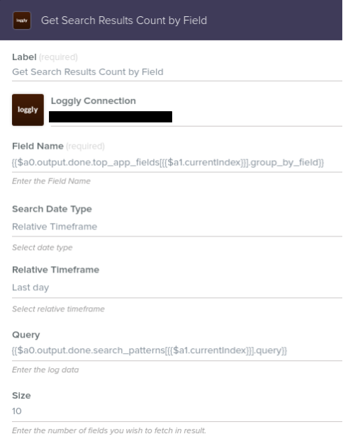 Step 4: Now, add the Get Search Results Count by Field action from Loggly and place it inside the Loop. Connect the Loggly action to the start point of the Loop on the left.