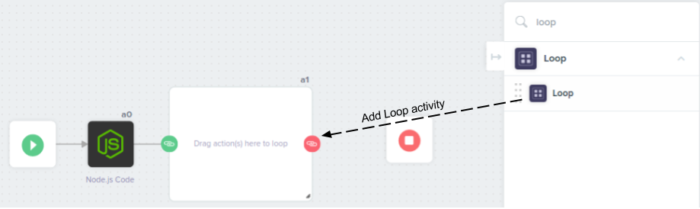 Step 3: Add a Loop from the Loop section and connect it to the Node.js Code block. Use the following settings for the Loop: