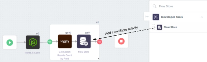 Step 6: Add Flow Store from the Developer tools section and place it inside the Loop along side the Loggly action. Connect it to the Loggly action on the left and connect it to the end of the Loop on the right. This action is used to store the data that is retrieved from Loggly. The data is stored in key-value pairs and is accessible outside of the Loop.