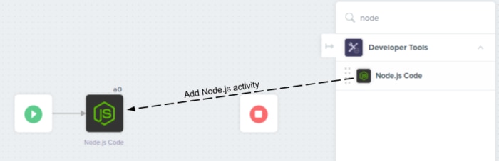 Step 1: Start with a blank canvas in Built.io Flow Enterprise. Add the Node.js Code action from the Utility > Developer Tools section in the panel on the right, and connect it to the Play button.