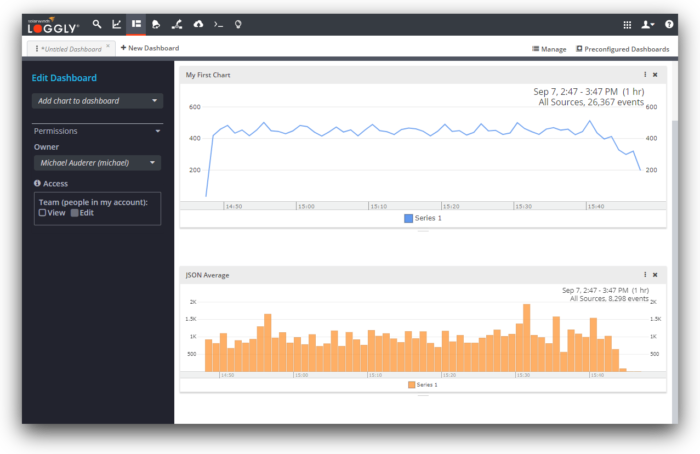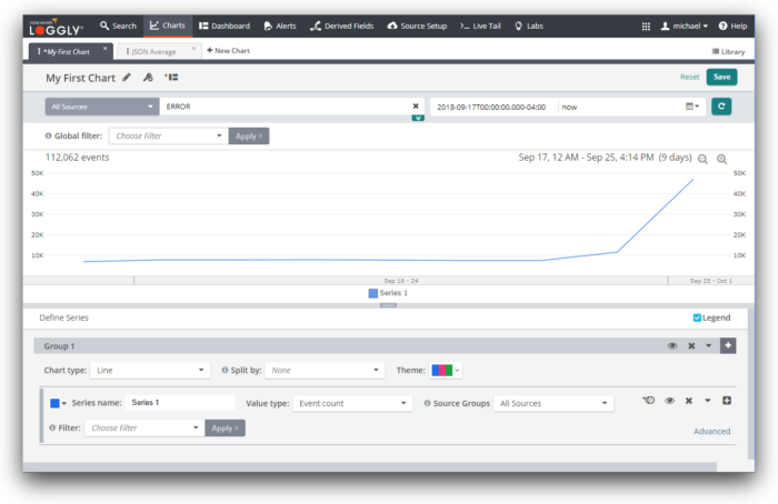 Creating a chart in Loggly can be very simple. From the Charts page, click the “New Chart” button. This will prompt you to name your new chart. Give it any name you want (multiple users can have the same chart names without conflict), and then you’ll be able to set up filters for your chart. Below, we are searching for errors from our test application. You can choose from a variety of chart types including Line, Area, Column, Point, Bar, and more.