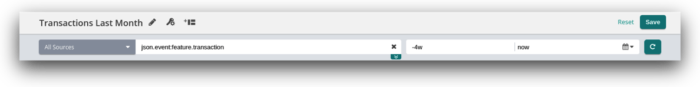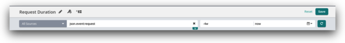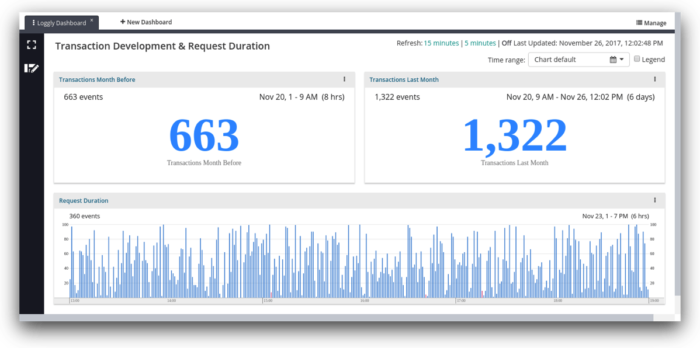 The event field makes it easy to restrict the dashboard view to this specific event. When creating a chart in Loggly, we use this name to select only the events we are interested in. The chart settings here then show the development over the last four weeks, but what time frame makes sense for you depends on your particular use case.