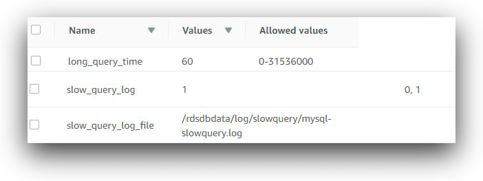 The image below shows three configuration parameters for recording slow queries in Amazon Aurora MySQL. First, the parameter “slow_query_log” is set to 1. This makes sure slow queries are written to a log file. The log file name is already set by the “slow_query_log_file” parameter. The parameter “long_query_time” is set to 60, which means queries taking 60 seconds or more to finish will be written to this log.