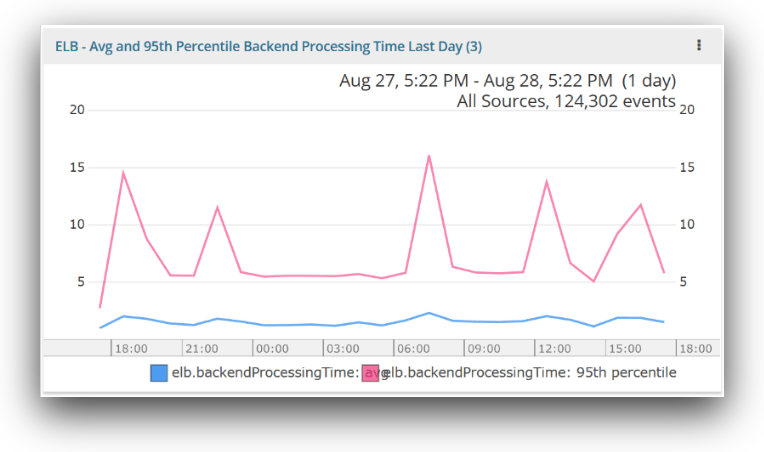 This graph gives the total elapsed time, in seconds, it takes to send the request to the registered instance from the ELB. Monitoring these metrics will help you detect performance or capacity problems. The average value shows you typical response time, while the 95th percentile shows the effect of outliers. (Read this post for more insight on why you can’t just use averages to measure performance.)