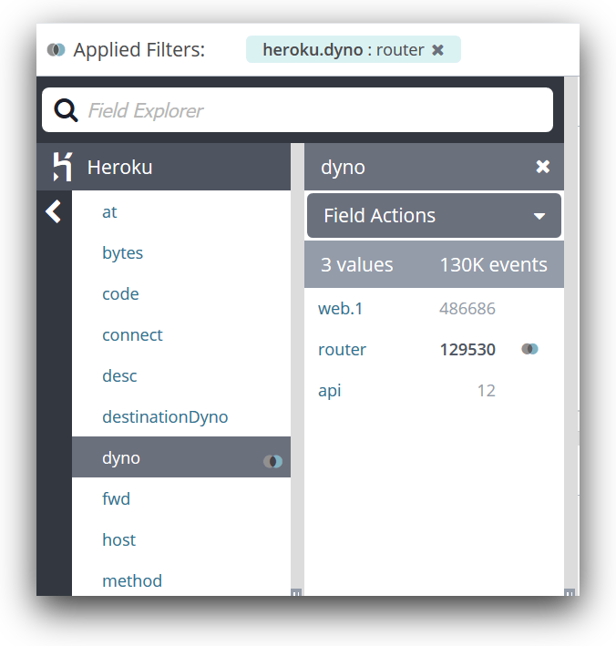 Now you can find Heroku logs easily using the Loggly Dynamic Field Explorer™. Just click on the Heroku logo to see all the fields that Loggly has automatically parsed. You can also filter down to see just router logs by clicking on the dyno field, then clicking the “router” value. Below, we see that almost 130,000 events are coming from the Heroku router.