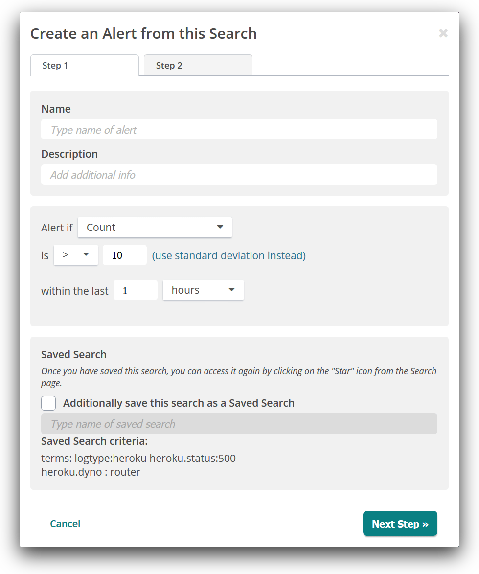 With Loggly, setting up an alert to monitor the amount of 500s returned by your app is easy and convenient. One way to do it is to filter on status equals 500 in the Field Explorer, and then click on the Add Alert button: