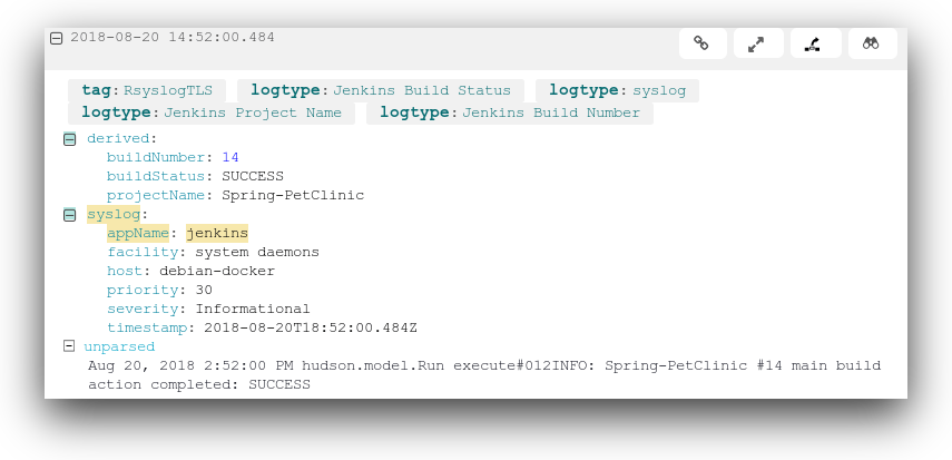 For example, the below event was generated on a successful build. The name of the Jenkins project, build number, and status were automatically parsed by Loggly. The build time and build error fields are generated by other events, and aren’t displayed here: