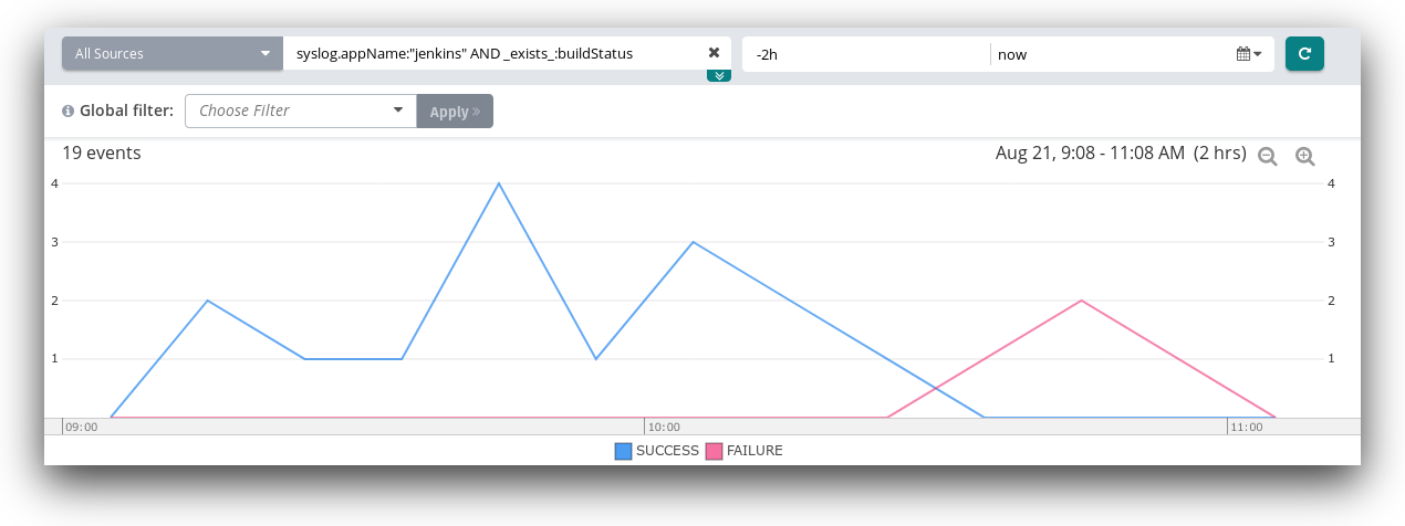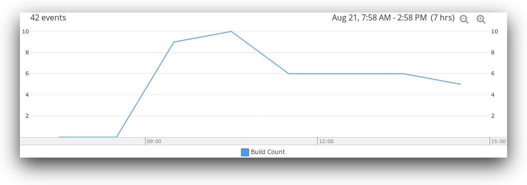 Sending this data to Loggly means we can visualize it using charts. In this example, we created a line chart based on the number of events containing a build status. Since Jenkins only logs the build status at the end of each build, this allows us to see the total number of builds performed over a period of time.