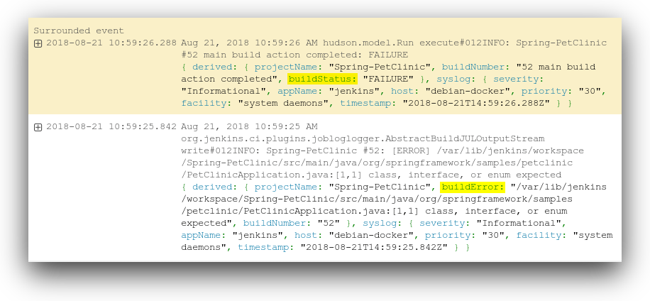 A failure raises two important questions: when did the build fail, and why did it fail? By logging each step in the build process, we can monitor for failures and identify the root cause using two of our derived fields: the build status and build error. Although these are logged in two separate events, we can use the Surrounding Events feature on the event containing the build status to find relevant messages. Depending on the application, information about the error can include file names, line numbers, and stack traces.
