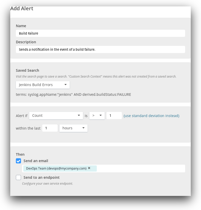 In the following example, we created an alert that sends an email to the DevOps team after detecting any failed builds within the past hour.