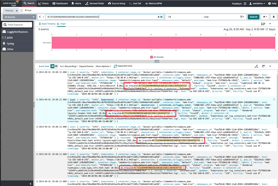 You are searching through events in Loggly, and there is logline calling showing an error, but it doesn’t tell you why. It may take some time to find the logline that can tell you why the error occurred. With AppOptics installed, that logline could also have an embedded traceID, which makes finding the other related loglines simple. Put the traceID from the logline that had the error into a Loggly search. It’ll provide all the relevant loglines associated with a transaction, thus making it easier to identify the logline that holds the answer to why there was an application error. The embedded traceIDs can help you with troubleshooting in Loggly.