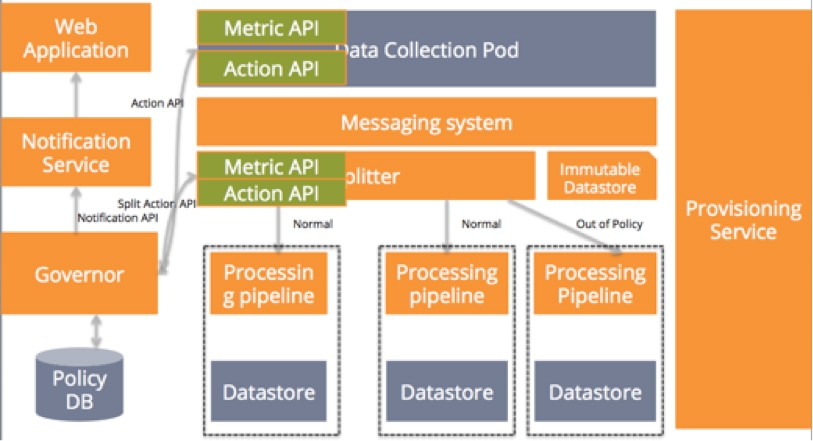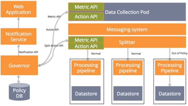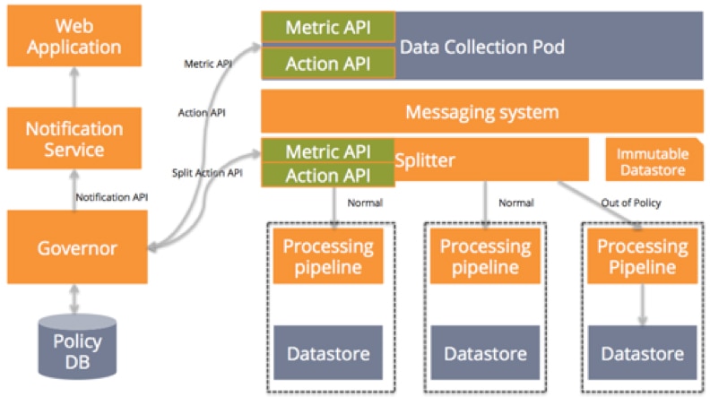 Let’s say that some customer suddenly starts sending an enormous bps load to your service. The governor would use metrics from the data collection pod to detect the increased activity. It would look at your defined policy and then invoke the action API on the data collection pod, the action API on the splitter, or both. If there is a need to notify the customer, it would invoke the notification service to send an appropriate notification. Below is the architecture diagram of our sample application with service governors, notification service in place.