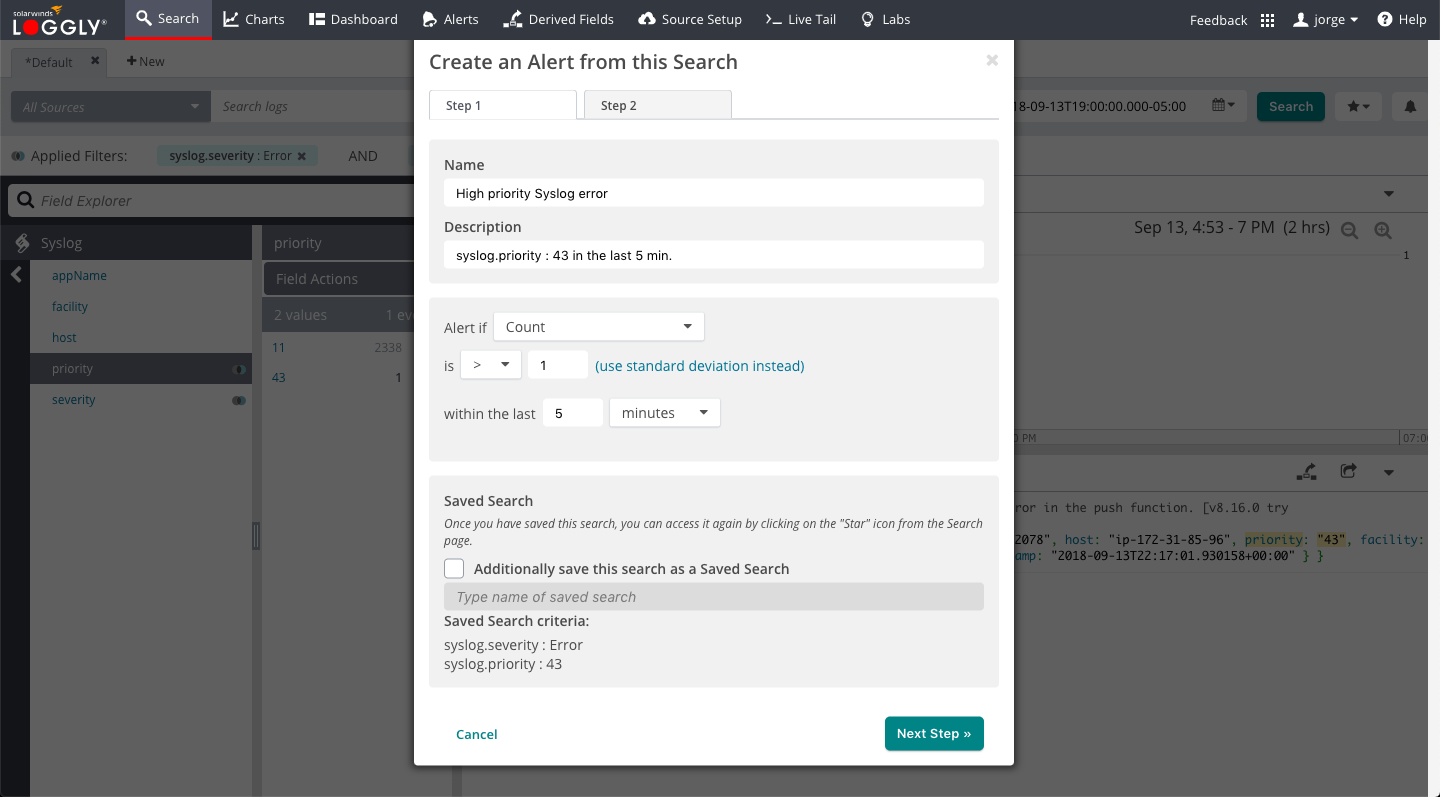 Custom alerts can be created from saved log searches, which act as key metrics of your application’s performance. Loggly even lets you integrate alerts to incident management systems like PagerDuty and OpsGenie.