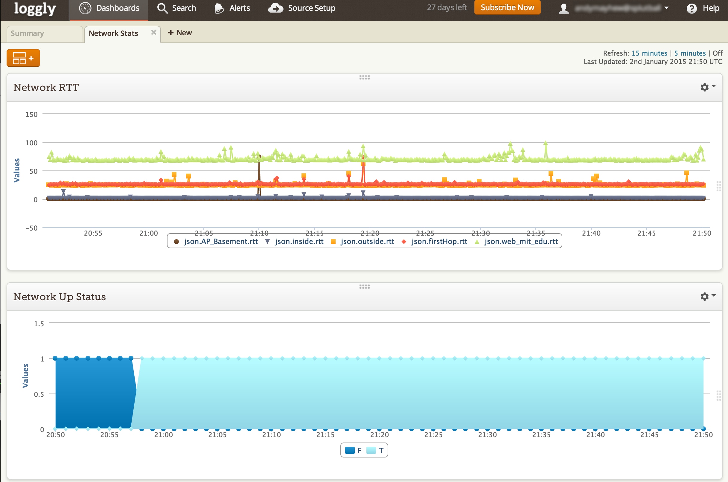 With the data now flowing into my Loggly account, everything I needed to debug my issues were all in one place.  I created dashboard widgets to be able to see when any element of my network was down, along with the ping response times from the network checks.  The visual elements allowed me to quickly see when something broken or if I was just experiencing a network slowdown.