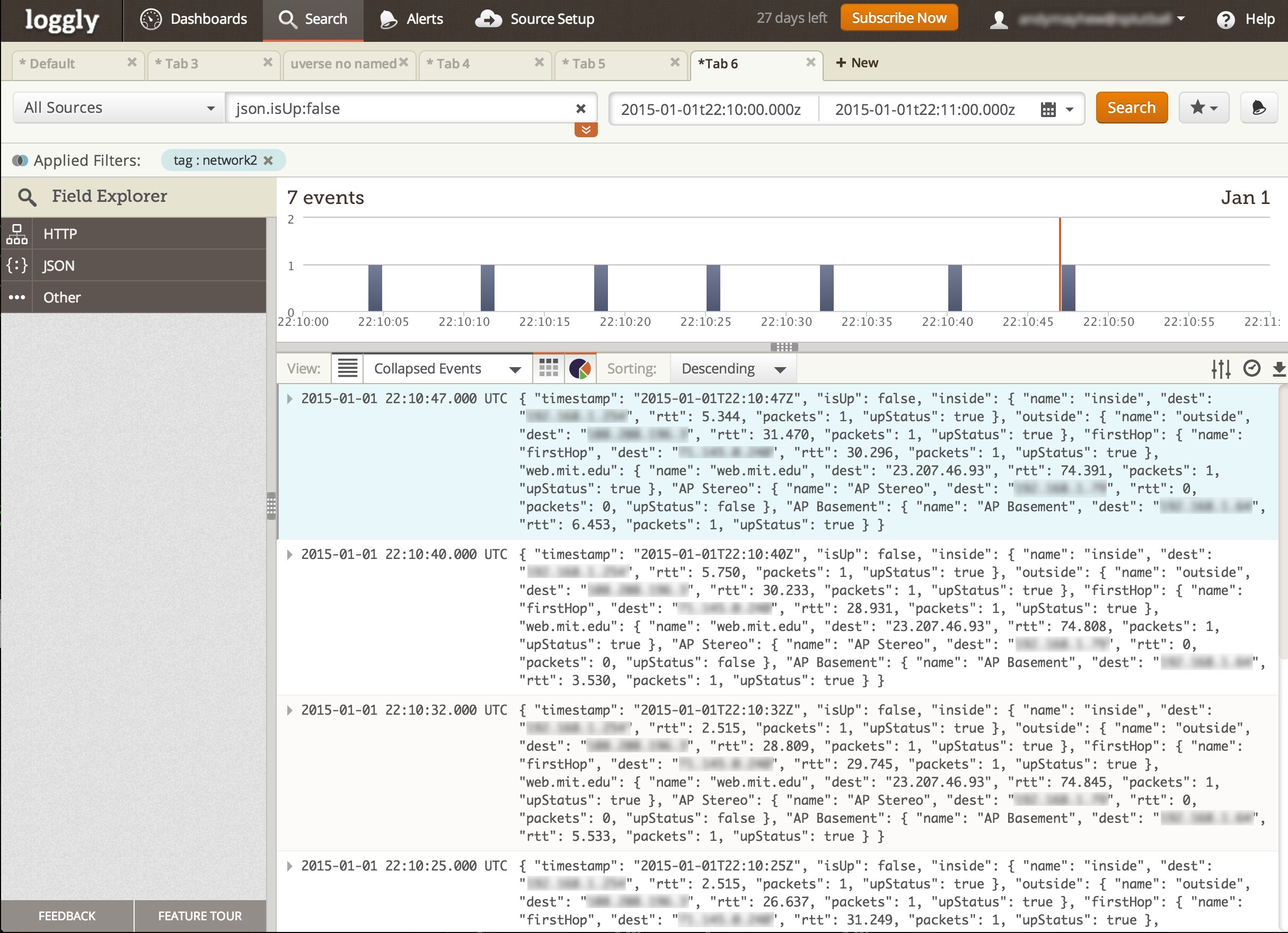 The above would now catch when my router rebooted and any other noteworthy events, but wouldn’t necessarily identify my problem. Unfortunately, recent updates to the Apple Airport Utility software have made it impossible to get Airport access points to send syslog events to a server. I needed another method to probe those devices.  I wrote another small script to ping each device on the network I cared about.  The results of the ping would then get massaged into a JSON message and sent to Loggly.  The script would check each internal access point, the internal and external interface of the router, the first hop from my house onto the Internet, and finally an additional Internet destination.