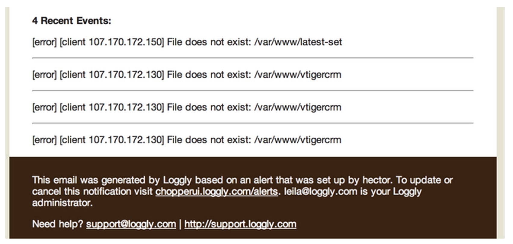 You also have the option to receive a sample of some of the events that triggered the alert. These are included in-line as part of the alert notification, so you can get a sense of what specific events triggered the alert even before you log into the Loggly console.