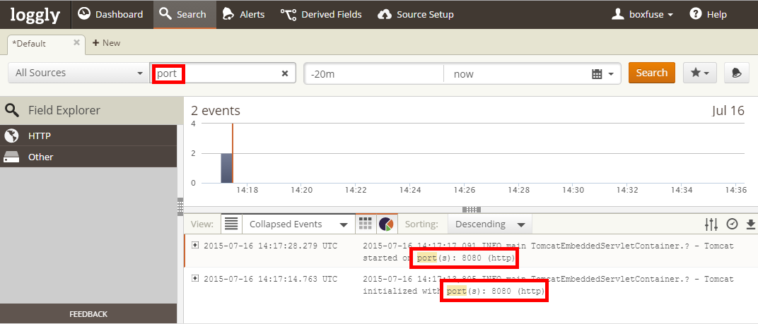 One of the most frequent sources of errors with Boxfuse is port misconfiguration. This happens when the application is configured to start on a specific port (say, http on 8080), yet the Boxfuse image has been configured to map that port differently (say http on 80). Boxfuse then uses its configuration for a number of things, including load balancer configuration, AWS security group creation, and health check setup. Having a misconfiguration here will either cause the application to be unreachable or the health checks to fail. Debugging this becomes a lot easier with Loggly on board. All you need to do is peek at your logs and compare them with your configuration.