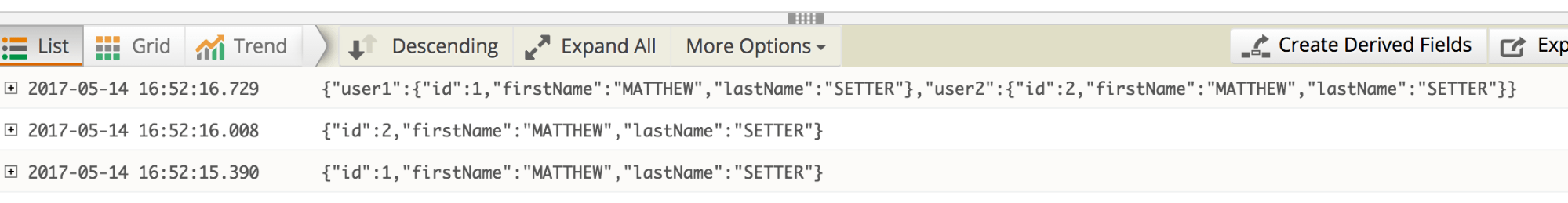And this logs our data to the Loggly interface as seen in the image below: