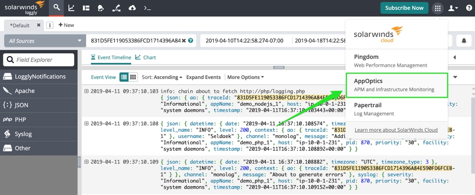 Start a free trial of AppOptics easily through the menu in the Loggly header.