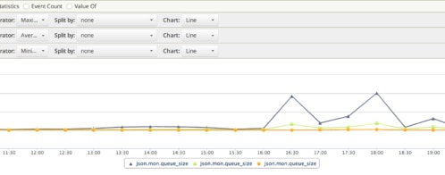 Each data point is a single test where we indexed batches of 8,000 events for a fixed period of time (2, 5, 10, 15 and 20 minutes, left to right). You can see that the results clumped together into fairly clear groups. Solr consistently indexed at about 18,000 eps, while ES started at about the same rate (although with greater variability) then gradually slowed down to around 12,000 eps as the test runs got longer.
