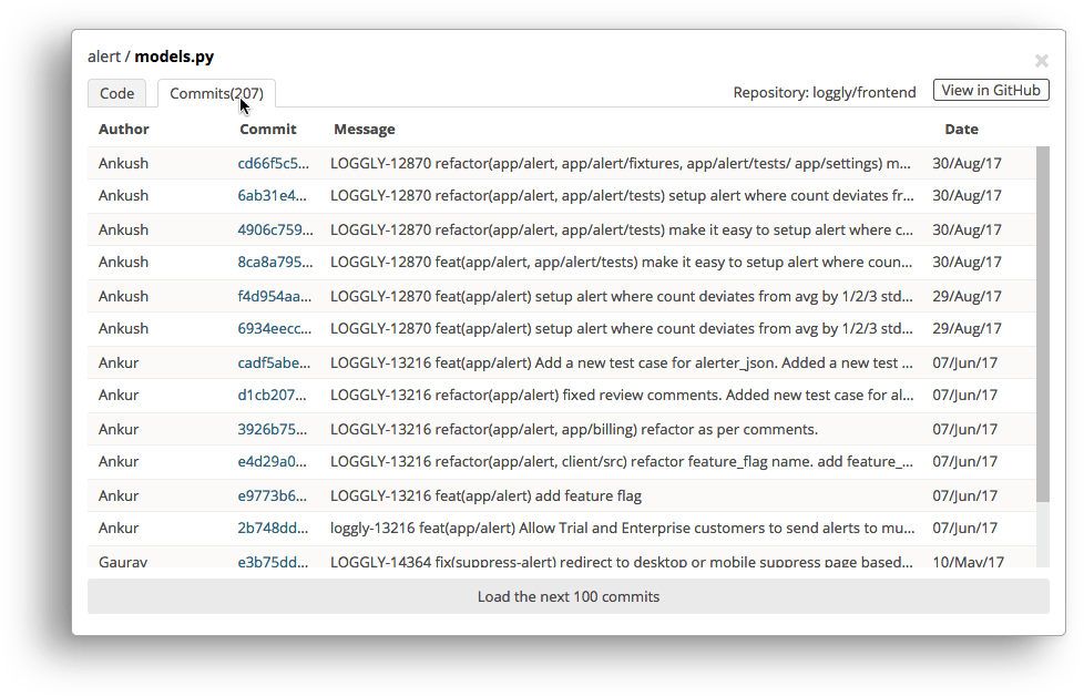 When an exception happens or a regression is reported, developers often start by putting change history under the microscope. So why go hunting? Now, you can quickly view all recent commits on those source code files matched with the exception and see which recent transaction may have caused the issue. This new-found visibility not only streamlines troubleshooting operations for your entire team but also enables better auditing of regressions.