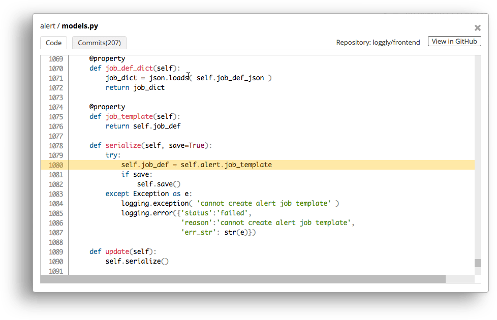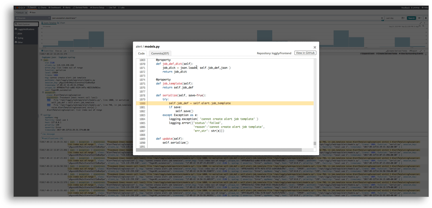The new integration enables you to match the exception and view the exact file and line in your source code from your GitHub repository, without leaving Loggly. Who hasn’t been pulled into troubleshoot bugs and escalations in source code they have not written themselves or are not entirely familiar with? Now, you don’t have to worry about reading documentation or asking other developers where to find the original source code.