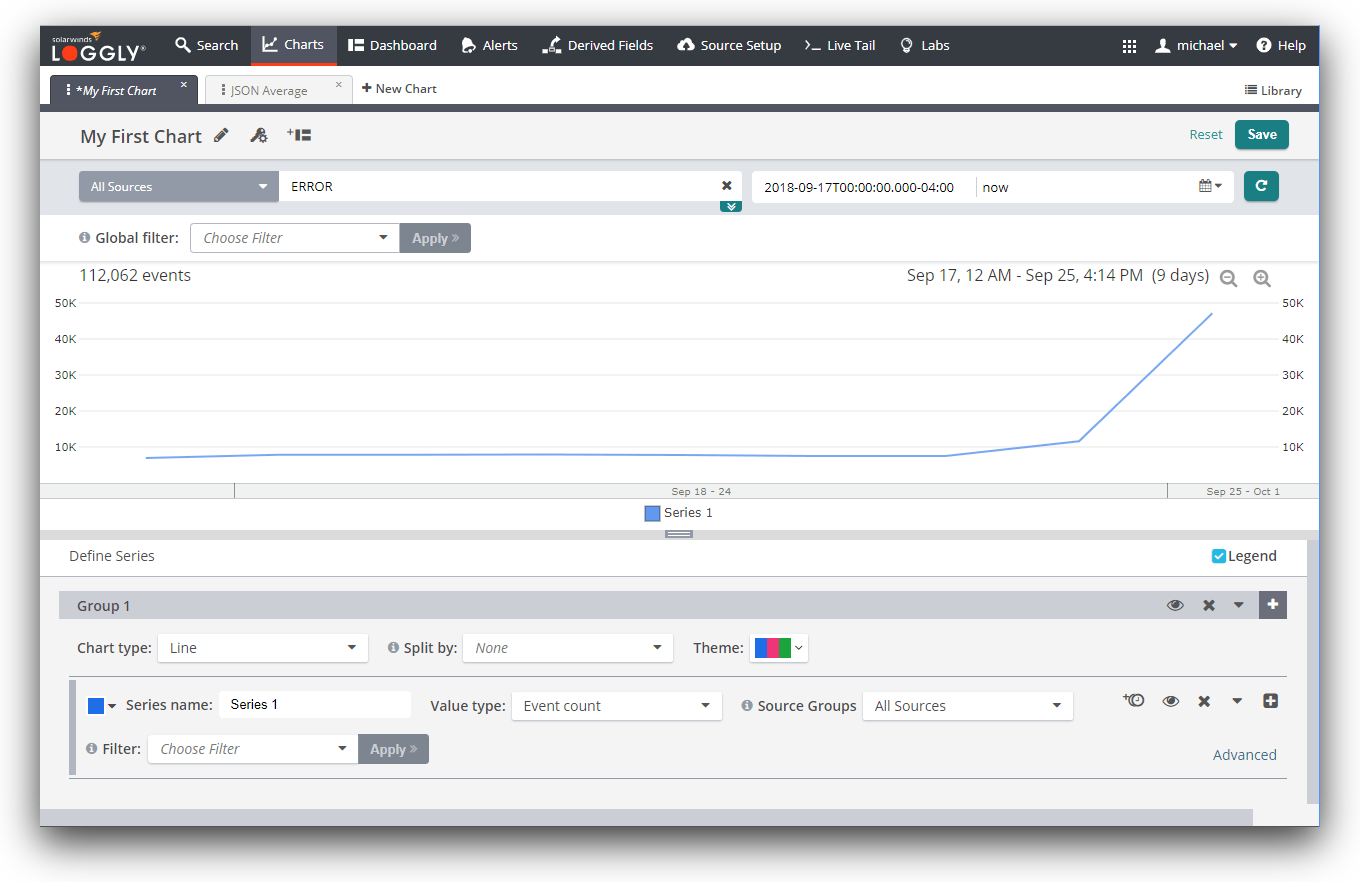 Creating a chart in Loggly can be very simple. From the Charts page, click the “New Chart” button. This will prompt you to name your new chart. Give it any name you want (multiple users can have the same chart names without conflict), and then you’ll be able to set up filters for your chart. Below, we are searching for errors from our test application. You can choose from a variety of chart types including Line, Area, Column, Point, Bar, and more.