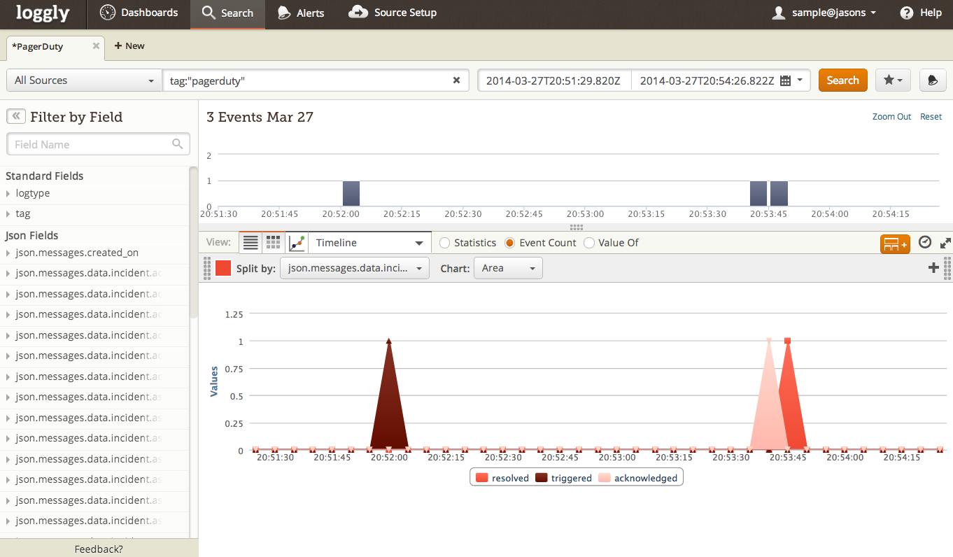 What if your company wants to give a gift to the DevOps team member who acknowledged the most incidents last weekend? Or track who has taken the heaviest load this month? Because Loggly can collect all of the relevant data from PagerDuty, we give you a quick and easy way to extend PagerDuty’s reporting capabilities. For example, you could:
