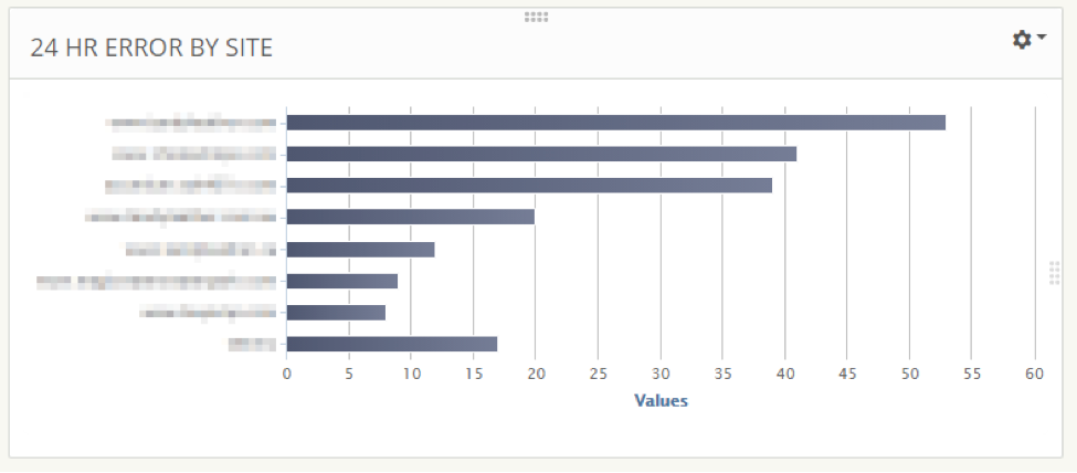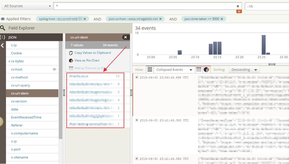 This trend graph allows us to quickly see which sites have been reporting errors. It’s based on a simple saved search “json.sc-status:500” and split by json.cs-host.