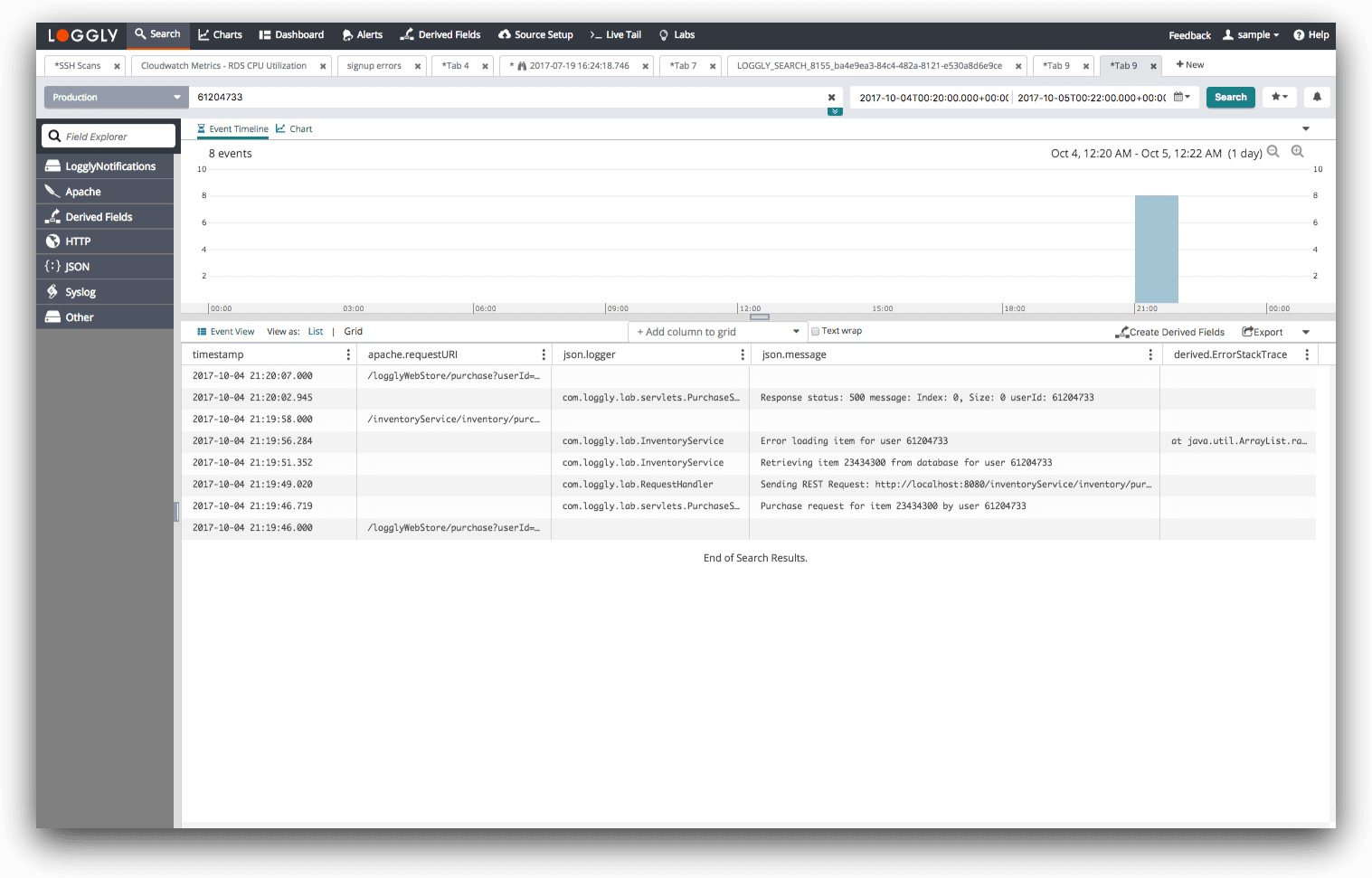 In my example, I’m searching on the user ID, which happens to be an eight-digit number. Since my customer support team told me roughly when the problem occurred, I also have a timeline to narrow my search results.
