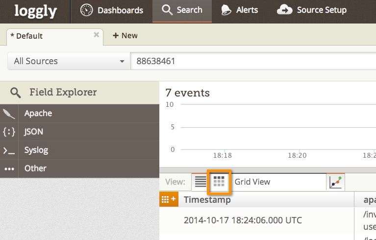 I want to quickly scan my events across systems to trace what happened. However, this can include a lot of noise because each system may have its unique log format. To add order to chaos, I find it easiest to use the Loggly grid view. This spreadsheet-like interface (shown in the screen shot at the top of this post) provides a nice columnar layout that immediately shows you a progression over time and highlights which parts of the infrastructure were involved.