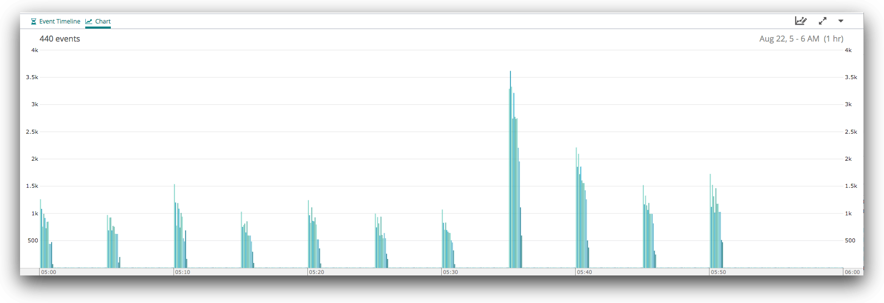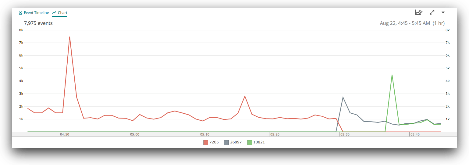 Zooming in further, and splitting by process ID, we can see the source of the three spikes from around 04:30 to 06:00: