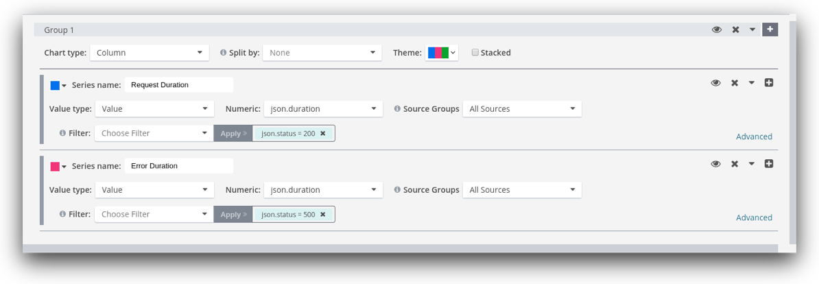 Once we only see the events we care about, we can then customize the chart the way we want. In this particular example, we create a Column chart for request duration, using different column colors for successful requests (status 200) and errors (status 500).