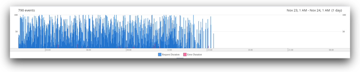 The resulting graph gives a good overview of the various request durations. If at some point, request duration changes regularly from the norm, we will see this immediately in this graph. Also, an increase in error responses will be noticeable as an increase in red bars in the graph.