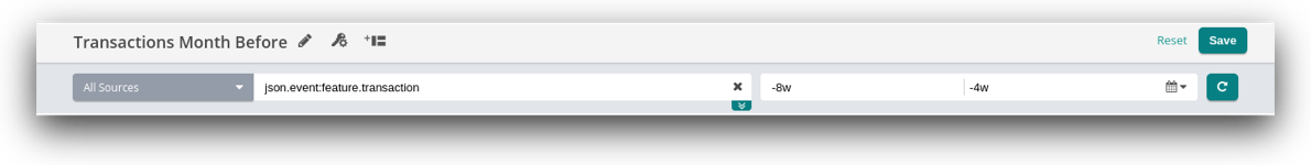 Here, you can see one way of naming your events to make it easier to namespace them and find unique names for each. Using these names, it is easy to select the relevant events in the chart. We create two chart, one for the events in the last month and one for the events in the month before that. This is easy using Loggly’s time syntax, using -4w and -8w for “4 weeks ago” and “8 weeks ago,” respectively.