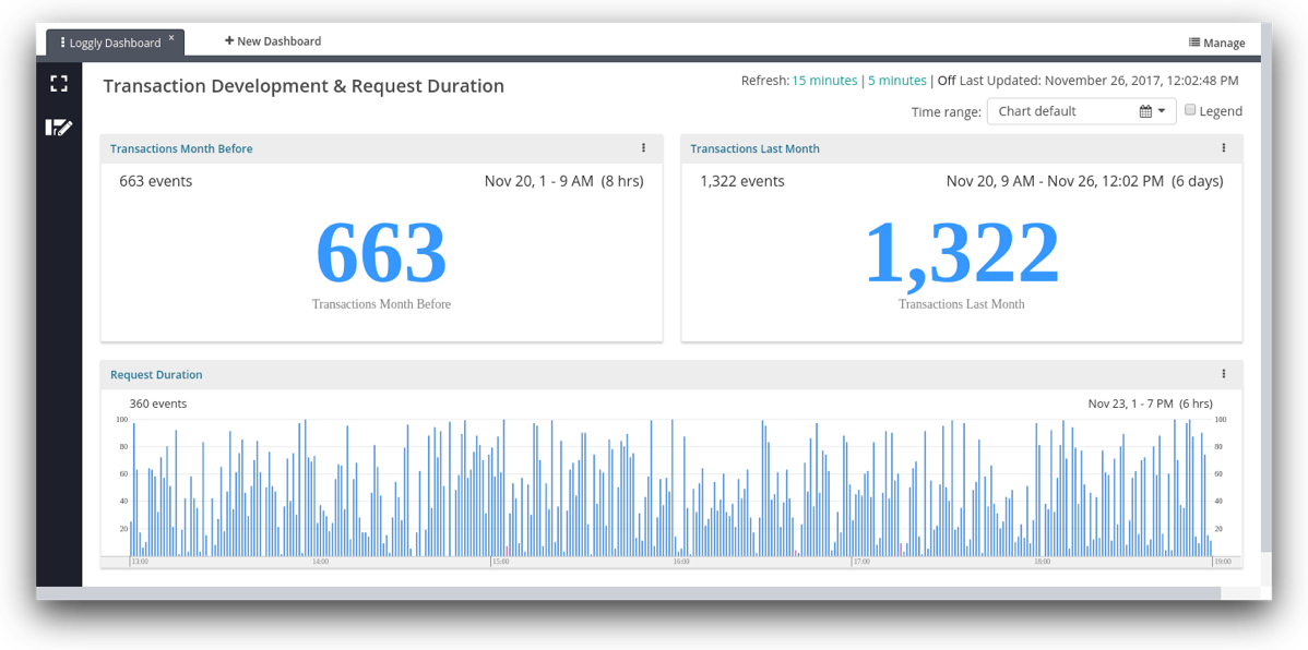 Understanding such trends requires analyzing long-term developments of log data, which is easier to do through a visual representation. Loggly’s Charts feature allows you to create charts and visualize data easily. You can create charts and add them to dashboards, which can be easily shared with the rest of your team using email, HipChat, Slack, and other collaboration tools.