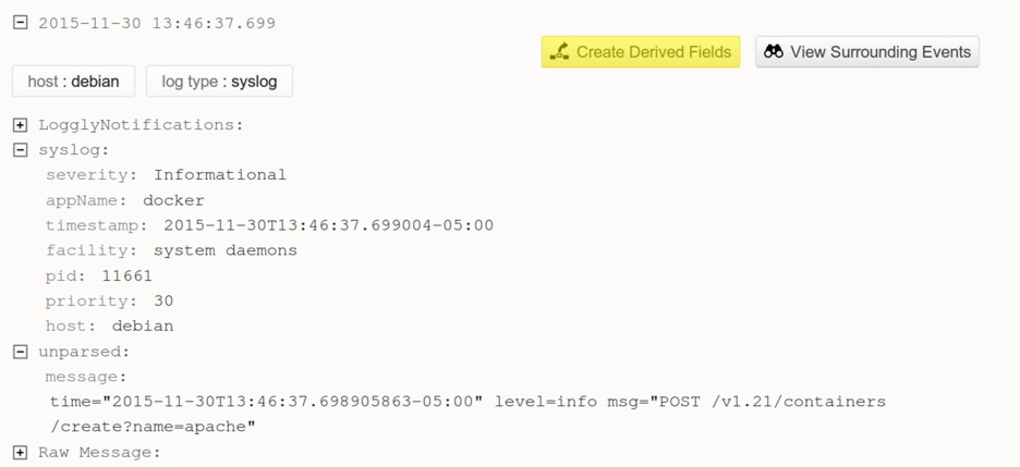 Depending on whether the Docker daemon is started through a terminal or through a process manager, events can take one of two forms. Events recorded through a process manager2 are stored in logfmt, a key-value pair format that can be easily parsed by Loggly either as a JSON entry or by using derived fields. Events recorded through the command line, on the other hand, are less structured and are designed for easier readability.