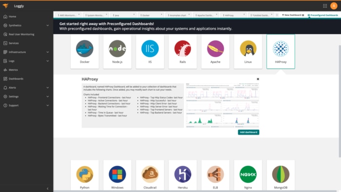 SolarWinds Loggly offers cloud-based log aggregation and analytics to help organizations solve their logging challenges. In addition to HAProxy logs, Loggly accepts a wide range of logs from different servers, operating systems, applications, and languages.