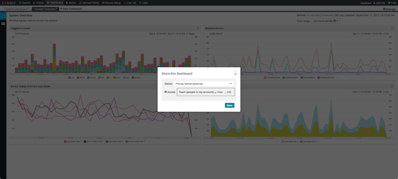 Furthermore, Loggly simplifies troubleshooting with custom as well as ready-to-use interactive dashboards that convert arcane logs into highly visual charts and reports. The graphical representation of KPIs, network, and application metrics gives you a bird’s-eye view of your entire setup. You can also share these dashboards with other team members and give them access to view or edit the reports.