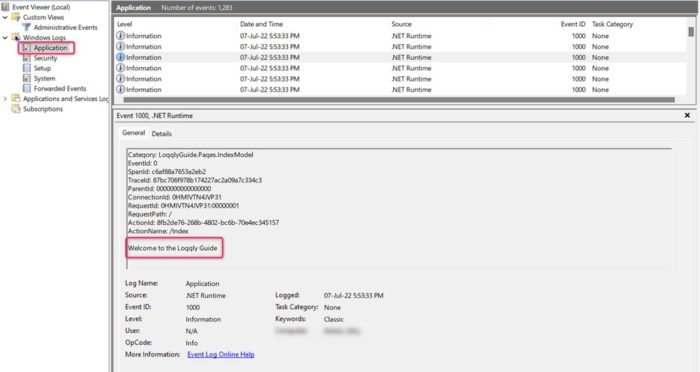 If running this application on Windows, you won’t see any information captured in the Windows EventLog because the EventLog only reports events higher than LogLevel.Warning. To change this behavior, update the value of the Logging property in appsettings as follows:
