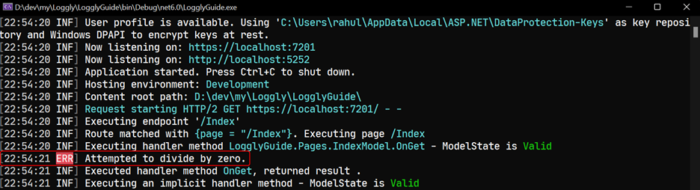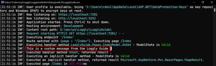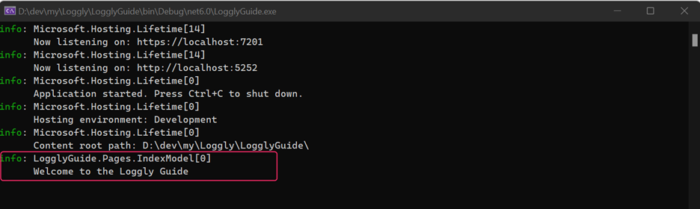 Launch the application by pressing F5 or with the command dotnet run. After navigating to the Index page, you’ll find the log statement printed on the console as follows: