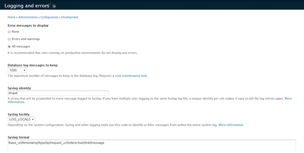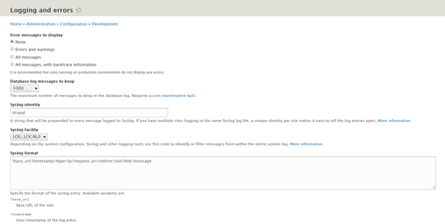 You can configure logging through the page found at Configuration > Development > Logging and Errors. The interface lets you specify errors display level, database log records limit, Syslog format (when Syslog module is installed), and other settings.